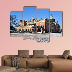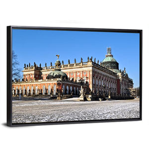 This canvas captures the Neues Palais with its snow-dusted courtyard, sculptures along the facade, and a distant dome, rendered in a realistic, slightly elevated wide view. Soft blues, greys and warm oranges give the scene a grand, historic and quietly serene mood. It suits modern interiors and adds a composed, architectural presence to room decor.