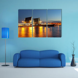 This cityscape captures the raised Blagoveshchensky Bridge at night, highlighting the drawbridge, glowing lights, and water reflections. The scene reads calm and illuminated, with a modern palette of blue, orange, yellow, and black. It suits contemporary home or office decor that favors architectural, serene imagery.