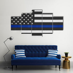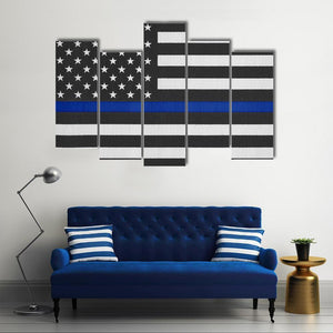 A modern, graphic depiction of the American flag featuring the thin blue line in black, white, and blue. The symmetrical composition reads as patriotic and symbolic, offering a respectful visual statement. Suited for contemporary homes and modern room decor that favor bold, graphic wall art.