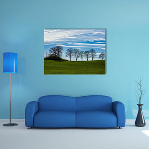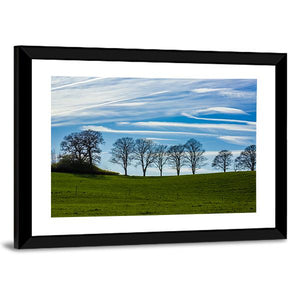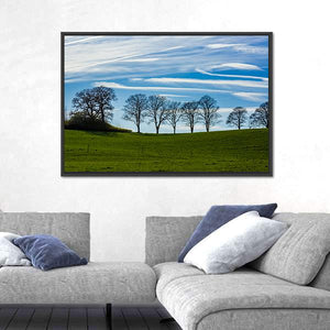 This vibrant canvas art features a serene landscape showcasing a row of trees silhouetted against a beautiful blue sky. The naturalistic style captures the expansive feel of a peaceful day, making it a lovely addition to any wall decor.