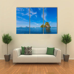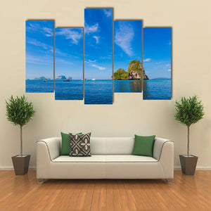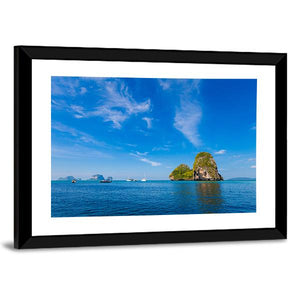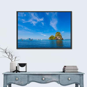 Tropical Phra Nang Railay Beach captures limestone islands, sailboats and calm blue water beneath wispy clouds in a photorealistic landscape. Its serene, bright mood suits modern or coastal rooms and adds a tranquil, natural touch to living spaces or bedrooms.