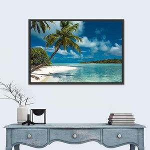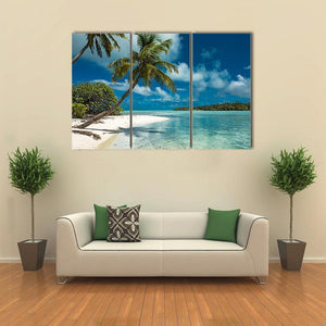 A photorealistic view of a tropical beach with palm trees, clear turquoise water, white sand and distant islands beneath a sunny sky. The scene feels serene and vacation-like, a calm focal point for modern living rooms, bedrooms, or a beach house.