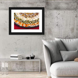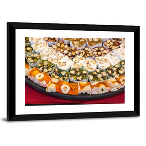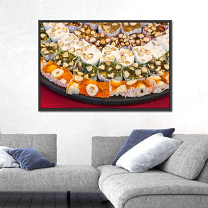 Turkish delight and assorted sweets are shown in an overhead food photograph, featuring nuts and fruit in a white, brown, orange, green and pink palette. The print feels appetizing and colorful, with a variety of flavors and toppings on display. It pairs nicely with kitchen or dining area decor and modern room styles.
