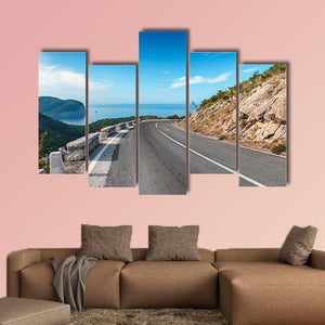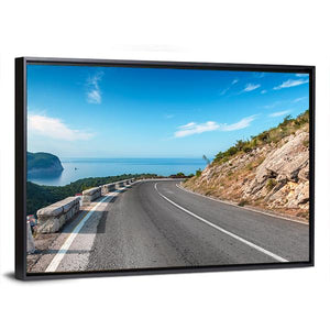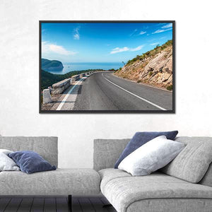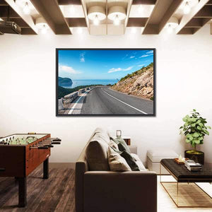 Turning Mountain Highway Canvas Wall Art depicts a winding road on a cliff overlooking the ocean, complete with white road markings, a stone roadside barrier, and clouds in the blue sky. The realistic landscape uses blues, greens, grays, whites, and browns to create a serene, adventurous scene. It suits modern homes and coastal or mountain-themed rooms.