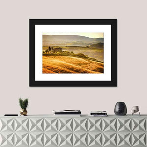 This beautifully crafted canvas features the tranquil scene of Tuscany with rolling hills, a charming farmhouse, and cypress trees bathed in morning light. Its warm palette of golden yellows, greens, and browns creates a serene atmosphere, perfect for bringing a rustic touch to your decor.