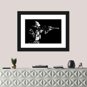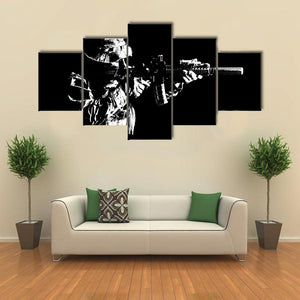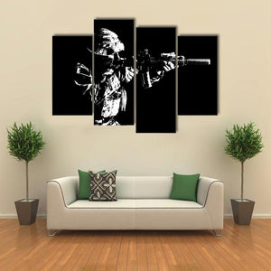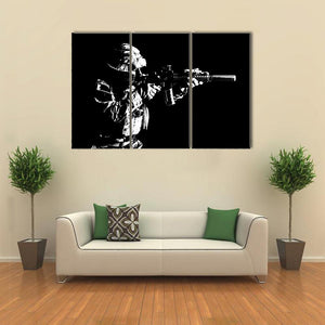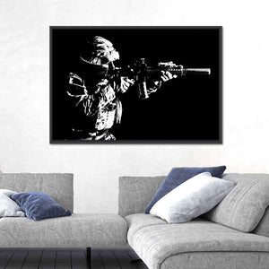 This canvas wall art features a soldier aiming a rifle against a striking black background. Its minimalist design and serious mood make it a compelling addition to modern décor, perfect for those who appreciate military themes.