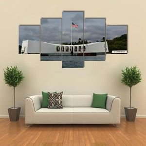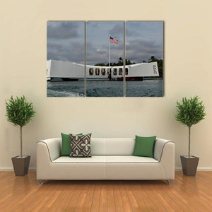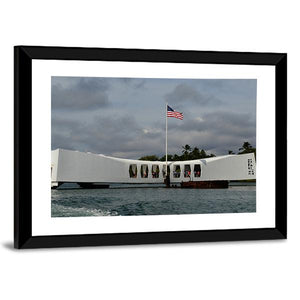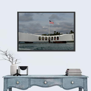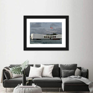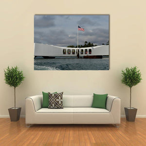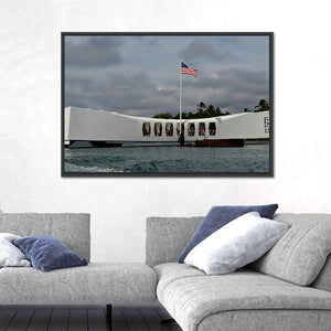 A realistic depiction of the USS Arizona Memorial at Pearl Harbor, centered above the water with an American flag flying beneath stormy clouds. Rendered in muted white, blue, gray, and green tones, the scene reads as somber and patriotic and fits house interiors and room decor with a modern or historical feel.
