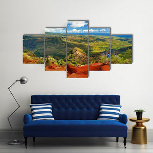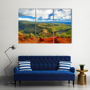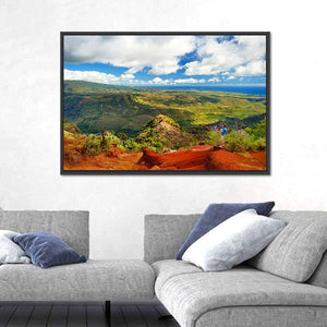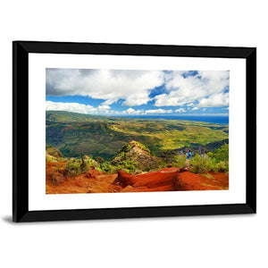 Awe-inspiring, photorealistic view of Waimea Canyon in Hawaii captured from a wide-angle, elevated perspective. Red rock cliffs sweep into a green valley and a distant ocean beneath fluffy white clouds, with a lone person in a blue shirt to show scale. Suits modern homes and living rooms that favor adventurous, scenic wall art.