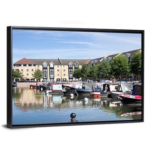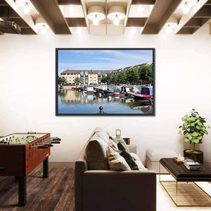 This landscape artwork captures a serene scene of boats and buildings reflecting on calm waters. With a bright blue sky and subtle cloud details, it invites tranquility into any space.