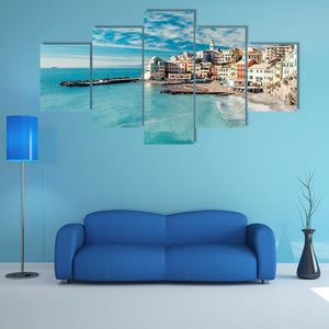 This canvas wall art captures a picturesque view of Bogliasco, a charming coastal town in Italy. With colorful buildings nestled on a hillside and calm turquoise waters under a bright sky, it brings a serene, sunny atmosphere to any space.