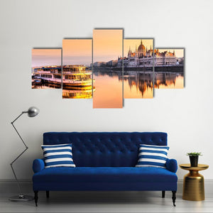 This photorealistic canvas art captures a serene view of the Budapest Parliament bathed in the warm colors of sunrise. Featuring ornate architecture and a gentle reflection on the river, it's an evocative piece perfect for bringing a touch of calm to any space.