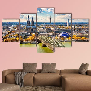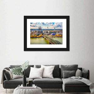A photorealistic cityscape of Cologne, Germany, showing the cathedral’s twin spires, an arched bridge and a greenish river under a sunny, historic sky. Rendered from an aerial, wide-angle perspective, the image uses green, blue, brown and grey tones for a vibrant, sunny atmosphere. This canvas fits well in modern or traditional living rooms and offices as a cityscape focal piece.