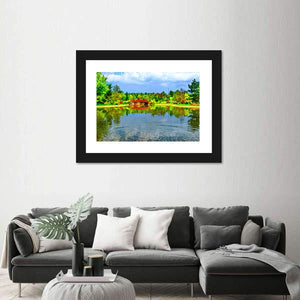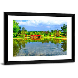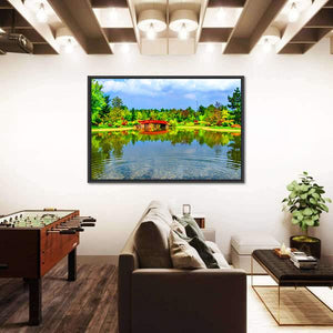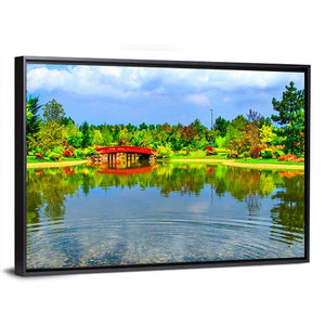 View Of Japanese Garden Canvas shows a red bridge over a clear pond with trees and their reflections. Rendered in vibrant, realistic color—greens, blues, reds and browns—and composed with a rule-of-thirds balance, it offers a serene, natural mood that suits homes and nature-inspired interiors.