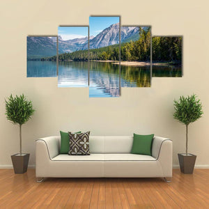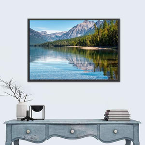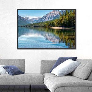 This beautiful landscape captures the serene scene of Lake McDonald, surrounded by majestic mountains and dense evergreen forests. The peaceful reflections in the clear water invite a sense of calm to your space.