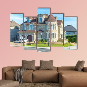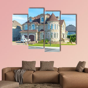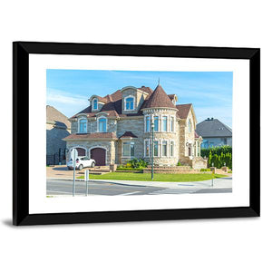 A realistic canvas print showing a large stone house with a turret roof, dormer windows, a white car on the street and a sunlit lawn. The warm beige, blue and green palette and rule-of-thirds composition give the scene a calm, summery feel that suits modern living rooms or entryways.