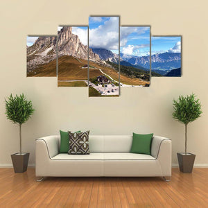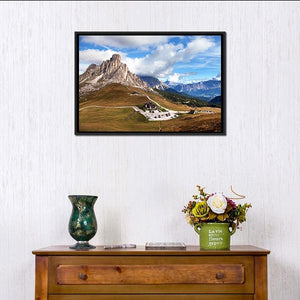 A photorealistic mountain landscape captured from a wide-angle, aerial perspective. Snow-tipped peaks and drifting clouds sit above roads, buildings and a parking lot, creating a grand, scenic mood that suits modern or nature-inspired living rooms and home offices.