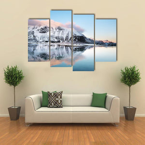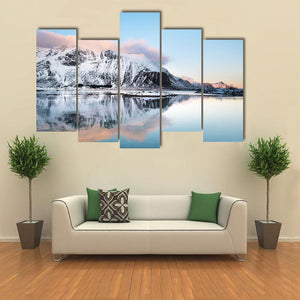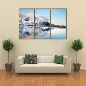 This canvas shows snow-capped mountains reflected in calm water beneath a sky brushed with pink clouds. The photorealistic landscape feels serene and cold, a quiet focal piece for nature-inspired rooms or spaces that favor calm visuals.
