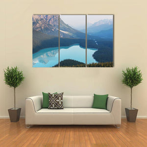 This canvas wall art beautifully captures the serene reflection of mountains in the tranquil waters of Peyto Lake. The modern landscape composition features a calming palette of blue, green, and gray, making it a perfect addition to nature-inspired decor.