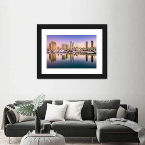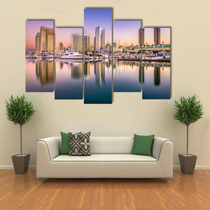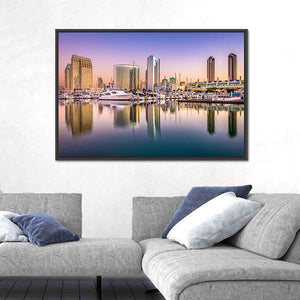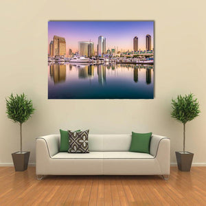 This canvas shows the San Diego city skyline at dusk, with yachts in the harbor and soft reflections on the water. A modern palette of purple, blue, white and gold gives the scene a serene yet vibrant mood, making it a natural fit for modern living rooms or home offices.