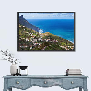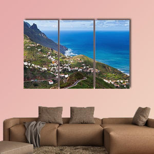 A photorealistic view of Taganana village in Spain, seen from a high-angle with red-tiled roofs, green hillsides, cliffs and the blue ocean with whitecaps. The scene feels serene and picturesque, with a winding road threading through the village. Works well in modern or coastal, nature-inspired rooms.