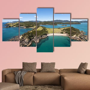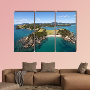 This photorealistic canvas shows an aerial view over Urupukapuka Island in New Zealand, with rocky outcrops, grassy hills, clear turquoise water and a sandy beach. The image conveys a serene, natural coastal mood. It pairs well with modern or coastal-style living rooms and room decor.