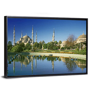 A peaceful, serene view of the Blue Mosque in Istanbul, with the mosque’s dome and multiple minarets reflected in a fountain. Rendered in a realistic style using blue, green, tan and white tones, this canvas print suits modern, travel-inspired rooms like living areas or entryways.