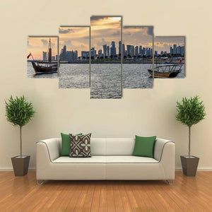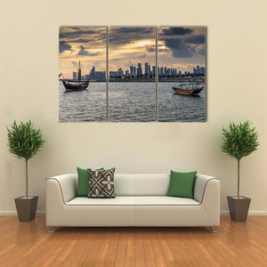 This realistic canvas print depicts sailboats and a modern city skyline along the ocean horizon at sunset. Two sailboats and a dhow pass beneath dramatic clouds, rendered in blues, oranges, grays and browns for a calm yet dramatic mood. The scene fits modern or coastal-inspired room decor.