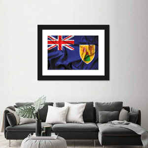 Photorealistic print of the waving flag of the Turks and Caicos Islands, showing the coat of arms with the Union Jack, conch shell, lobster, and pineapple. The rule-of-thirds composition and a blue-led palette with red, white, yellow, green, and pink accents give a formal, patriotic mood that suits modern home wall decor.