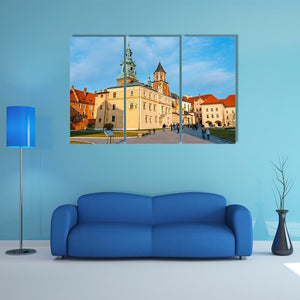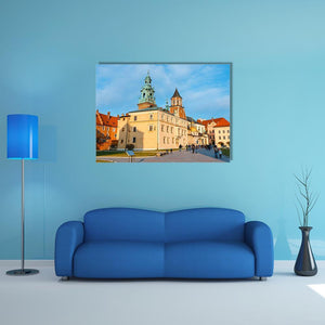 Wawel Castle in Krakow is captured as a realistic cityscape, showing two prominent towers and orange tiled roofs under a sunny sky. Small figures of people walking and a palette of blue, yellow, orange and green give the scene a warm, lived-in feel, making it a natural choice for modern home decor.