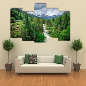 A realistic nature photograph of a mountain river carving through a dense coniferous forest beneath distant snow-capped peaks and a cloudy sky. Greens, blues, whites and grays with fast-flowing white water give the scene a majestic, serene mood that suits modern or nature-themed rooms.