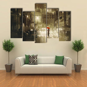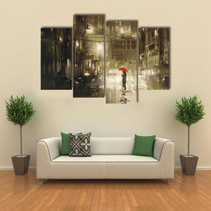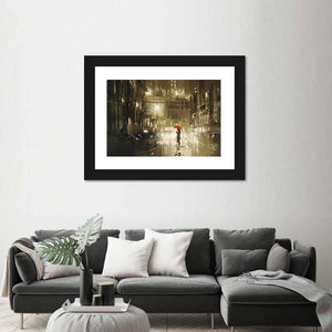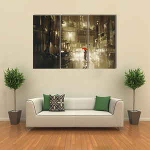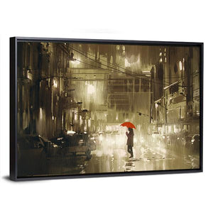 This canvas art features a lone figure with a red umbrella walking through a rainy city street. The expressive and painterly style captures a melancholy mood, enhanced by reflections on the wet ground. It’s a beautiful addition for anyone seeking to evoke a thoughtful atmosphere in their space.