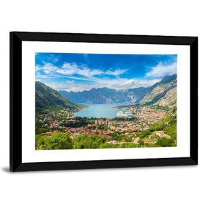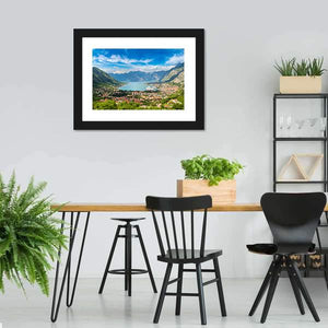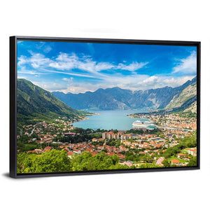 This beautiful canvas print captures the serene view of Kotor Town, nestled between mountains and a sparkling bay. Featuring red-tiled roofs and a white cruise ship, it evokes a bright and expansive atmosphere perfect for any space.