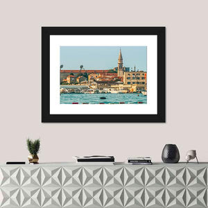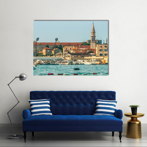 This canvas art captures a tranquil view of a coastal town in Montenegro, showcasing colorful orange-tiled roofs and charming stone buildings. The scene is bathed in sunlight, with calm water and boats gently docked, creating a peaceful and scenic atmosphere.