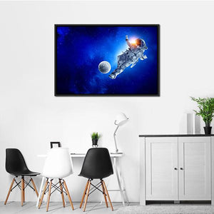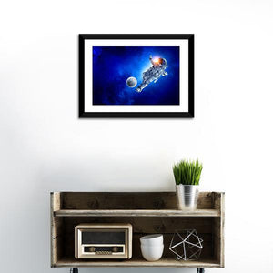 This dynamic canvas art captures an astronaut engaged in a playful soccer game among the stars. Featuring a vibrant palette of blue, white, and orange, it brings an awe-inspiring and adventurous vibe to any space.