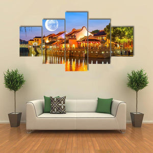 Suzhou’s waterfront unfolds at night in a realistic canvas print, showing river reflections, a full moon, and glowing lights on the buildings. Calm blue and warm golden tones give the scene a peaceful, romantic feel that fits well in living rooms and bedrooms.