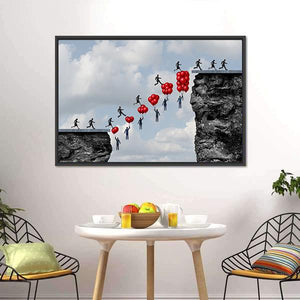 An abstract canvas showing tiny figures running up a staircase of red balloons and some jumping from a cliff beneath a cloudy blue sky. The symbolic composition—with depth, perspective and rule-of-thirds—feels hopeful, ambitious and determined, a natural fit for modern offices or home workspaces.