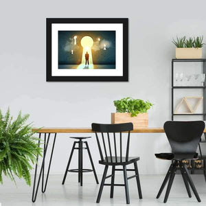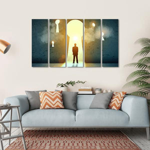 This canvas features a striking silhouette of a businessman framed by a keyhole shape filled with bright light. The blend of gray, yellow, and white creates a mysterious and hopeful atmosphere, making it a captivating addition to any contemporary space.