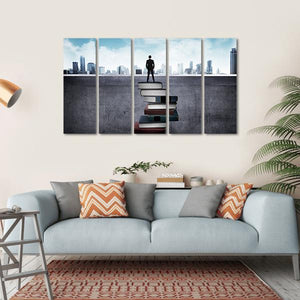 This canvas art combines a cityscape with a stack of books forming stairs, featuring a silhouette of a man standing triumphantly. Its aspirational and determined vibe makes it a motivational piece for any space that encourages growth and achievement.