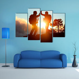 Hikers High Five Canvas Wall Art shows two silhouetted hikers sharing a high five on a mountain ridge at sunset, with hiking poles and a lone tree. Composed using the rule of thirds and a bold orange, blue, black and yellow palette, the scene feels triumphant, adventurous, and peaceful. It works well as room decor in modern living rooms, entryways, or home offices.