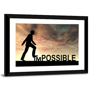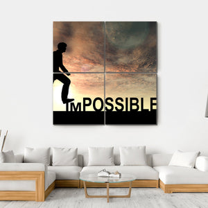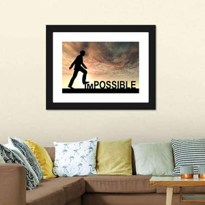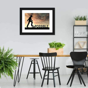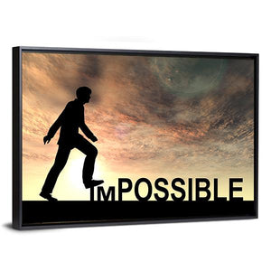 This modern typography canvas features the word 'IMPOSSIBLE,' with a silhouette of a person stepping over the letters 'I' and 'M.' Its warm palette of black, white, yellow, and orange creates an inspirational vibe, making it an engaging addition to your home or office decor.