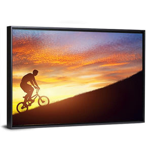This striking canvas features a silhouette of a cyclist riding at sunset, capturing an adventurous spirit. Its blend of orange, yellow, and purple hues creates a serene atmosphere, making it a perfect addition to modern wall decor.