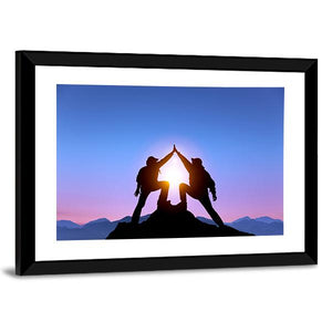 This striking canvas features two hikers silhouetted against a vibrant mountain backdrop, capturing a moment of achievement and adventure. The warm hues of orange and purple in the sunburst evoke a sense of tranquility and inspiration, making it an excellent choice for any space that celebrates ambition and success.