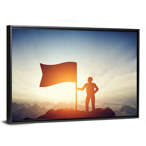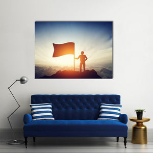 A silhouetted man holds a bright orange flag against a sunrise over mountain peaks, a scene that feels triumphant and peaceful. The image follows a rule-of-thirds composition and uses a restrained orange, blue, and grey palette to keep the mood inspiring. This modern landscape print works well in contemporary living rooms, home offices, or entryways.