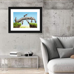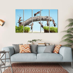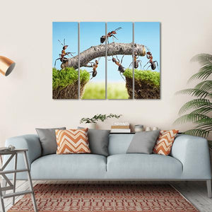 This canvas artwork captures a group of ants working together to build a bridge, showcasing their teamwork and cooperation in nature. The vibrant colors of green, brown, and blue enhance the natural scene, creating a lively and industrious atmosphere.