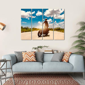 This canvas art captures the spirit of adventure with a motorcycle rider soaring down a sunlit road beneath a blue sky dotted with fluffy clouds. Its bright colors and modern style make it an ideal addition to your living space, evoking feelings of freedom and exploration.