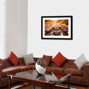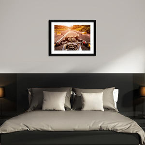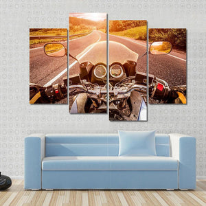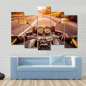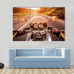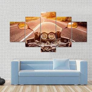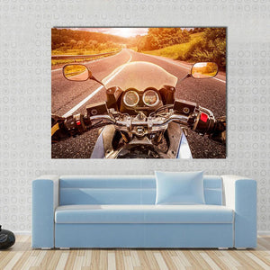 This canvas art features a motorcycle dashboard from a first-person perspective, inviting you on an adventurous ride down an open road at sunset. The rich palette of orange, green, and blue evokes feelings of freedom and speed.