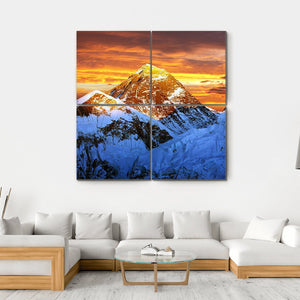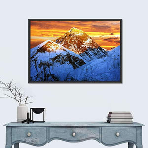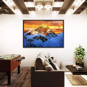 Experience the majesty of Everest in this breathtaking landscape. The canvas captures a sunlit peak surrounded by icy formations and a dramatic, cloudy sky, evoking a sense of epic adventure and natural beauty.