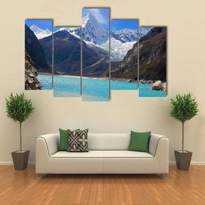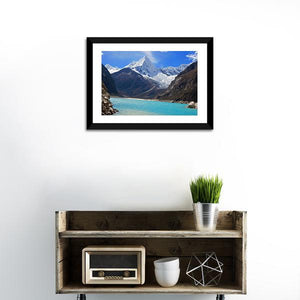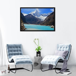 Alpamayo Peak Canvas Wall Art depicts a mountain lake framed by jagged, snow-capped peaks and a glacier. The photorealistic scene—with vibrant turquoise water and a rocky shoreline—feels serene, majestic, and vast and fits well in modern or nature-inspired rooms.