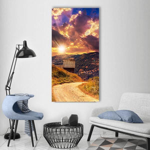 A winding mountain road leads up to a wooden hut on a sunlit hill, captured during a dramatic sunset. Sun rays pierce blue-gray clouds and wash the green and brown terrain in warm orange and yellow tones, creating a vibrant yet serene landscape. Works well as nature-focused wall decor for modern living rooms or entryways.