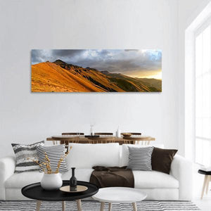 Autumn At Kackars Mountains captures a panoramic mountain range at golden hour, with sunlight on the slopes and dramatic clouds. The photorealistic image highlights layered peaks and strong diagonal lines, creating a dramatic, majestic, yet serene mood that’s well suited to modern or nature-inspired rooms.